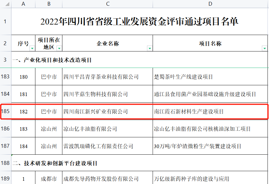近日,四川省經(jīng)濟和信息化廳公布了2022年四川省省級工業(yè)發(fā)展專項資金現(xiàn)場核實通過項目的名單,四川路橋新材料集團鑫展望公司“南江霞石新材料建設(shè)項目”成功入選,獲得省級工業(yè)發(fā)展專項資金218萬元。