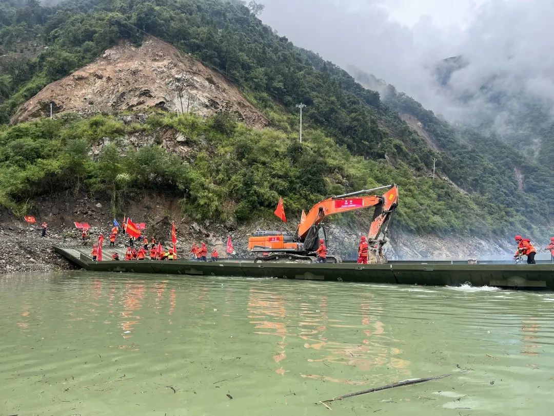 瀘定地震發(fā)生后,四川省道217線震中磨西到石棉段的28公里路段多處中斷、損毀嚴(yán)重,大型機(jī)械設(shè)備難以進(jìn)入受災(zāi)點(diǎn)位。蜀道集團(tuán)搶建舟橋,9月9日上午,蜀道集團(tuán)第一臺(tái)走水路進(jìn)入受災(zāi)點(diǎn)的重型裝載機(jī)成功登上舟橋,保障物資運(yùn)輸。