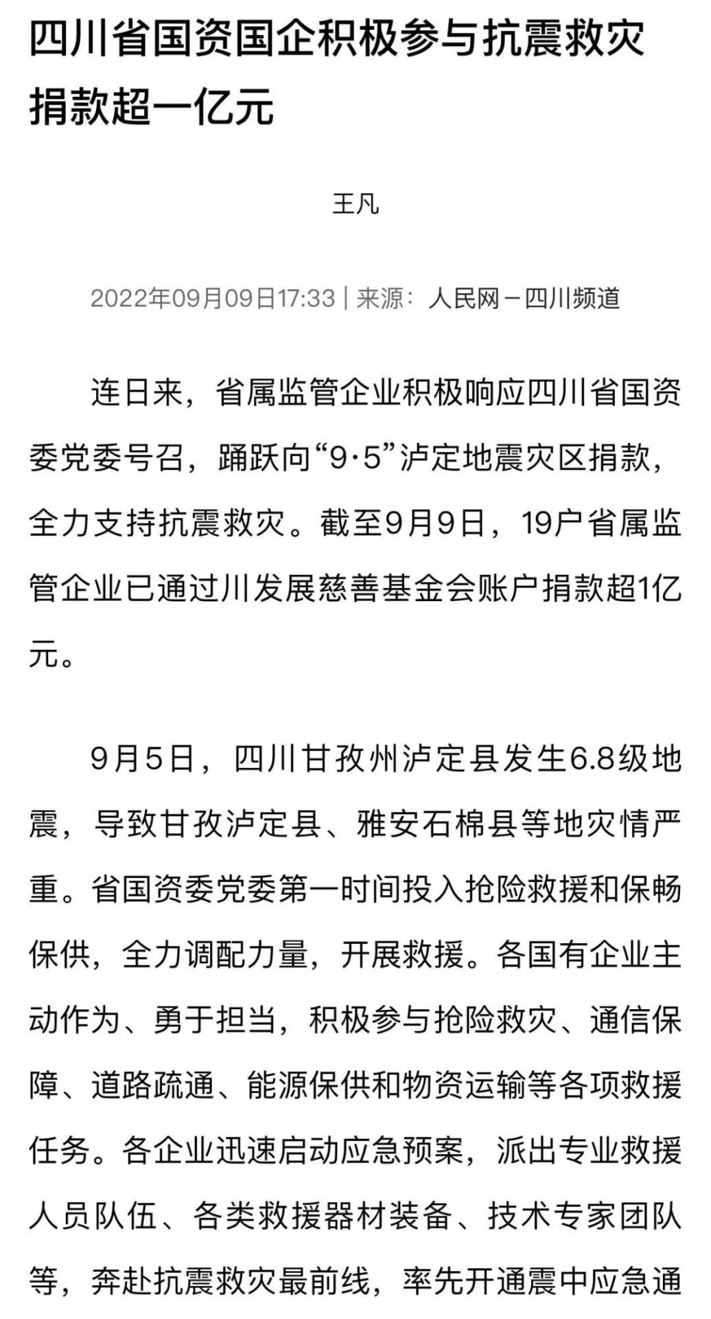 連日來,省屬監(jiān)管企業(yè)積極響應(yīng)四川省國(guó)資委黨委號(hào)召,踴躍向“9·5”瀘定地震災(zāi)區(qū)捐款,全力支持抗震救災(zāi)。截至9月9日,19戶省屬監(jiān)管企業(yè)已通過川發(fā)展慈善基金會(huì)賬戶捐款超1億元。