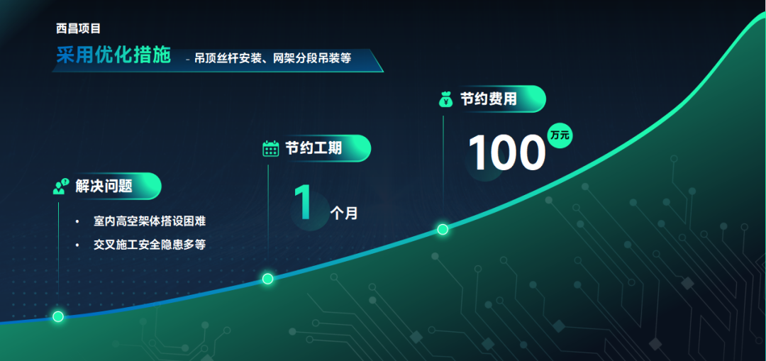 西昌高鐵新城項(xiàng)目采用吊頂絲桿安裝、網(wǎng)架分段吊裝等優(yōu)化措施,既解決了室內(nèi)高空架體搭設(shè)困難、交叉施工安全隱患多等問(wèn)題,又節(jié)約工期一個(gè)月,節(jié)省費(fèi)用近百萬(wàn)。